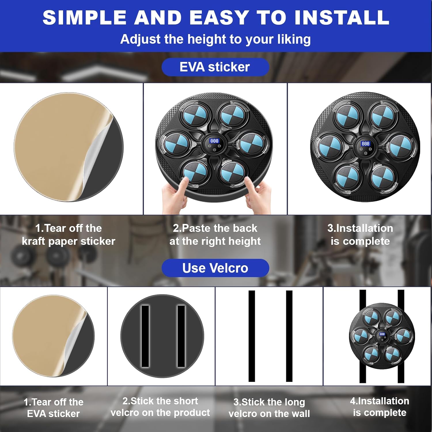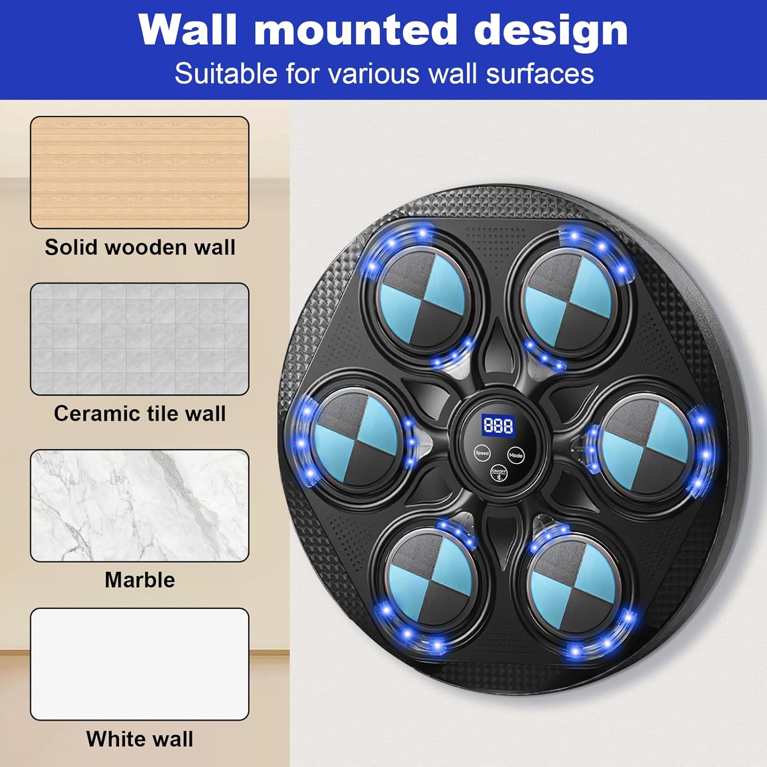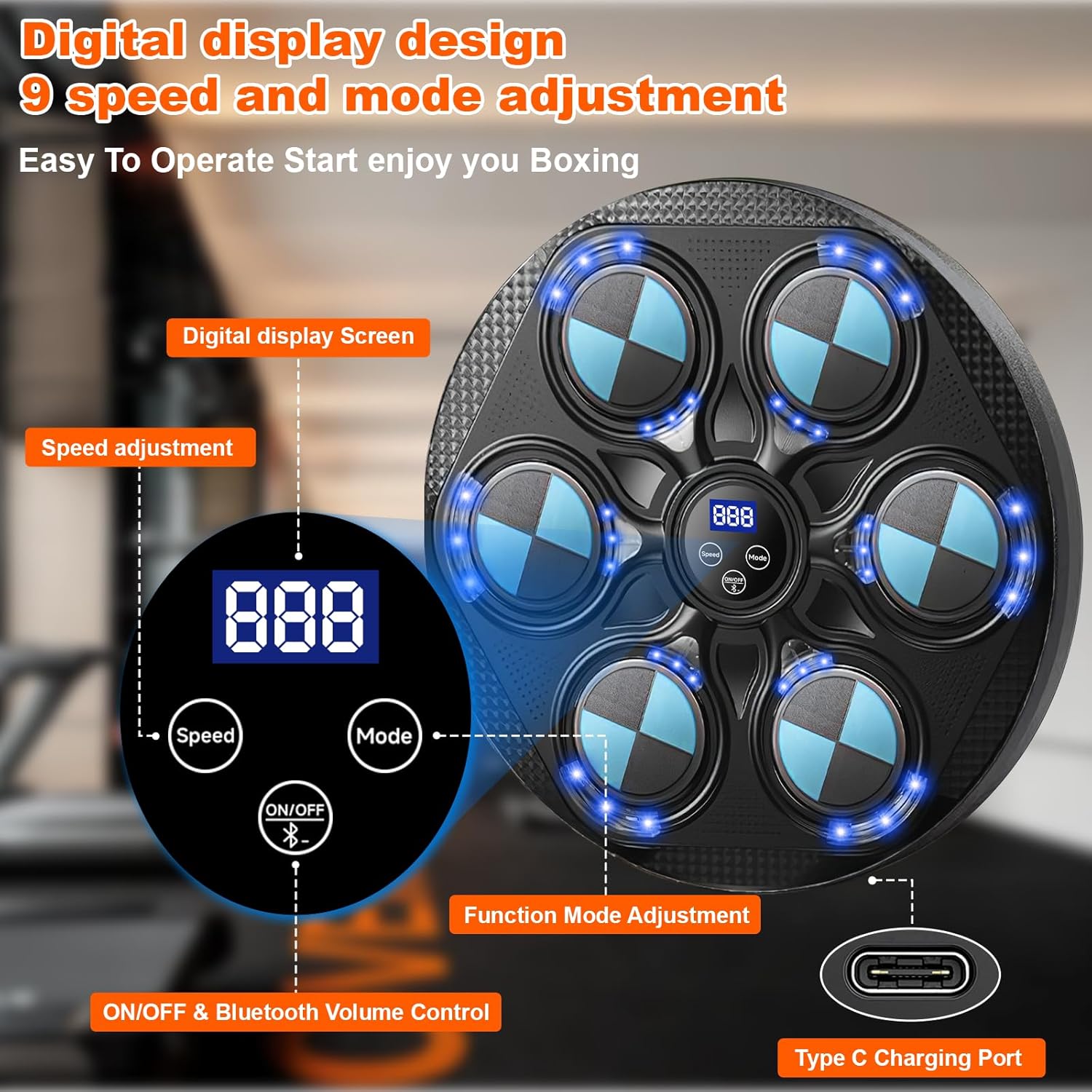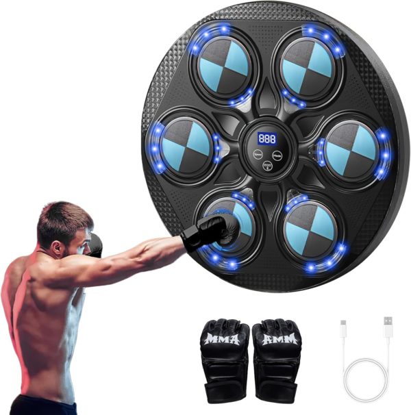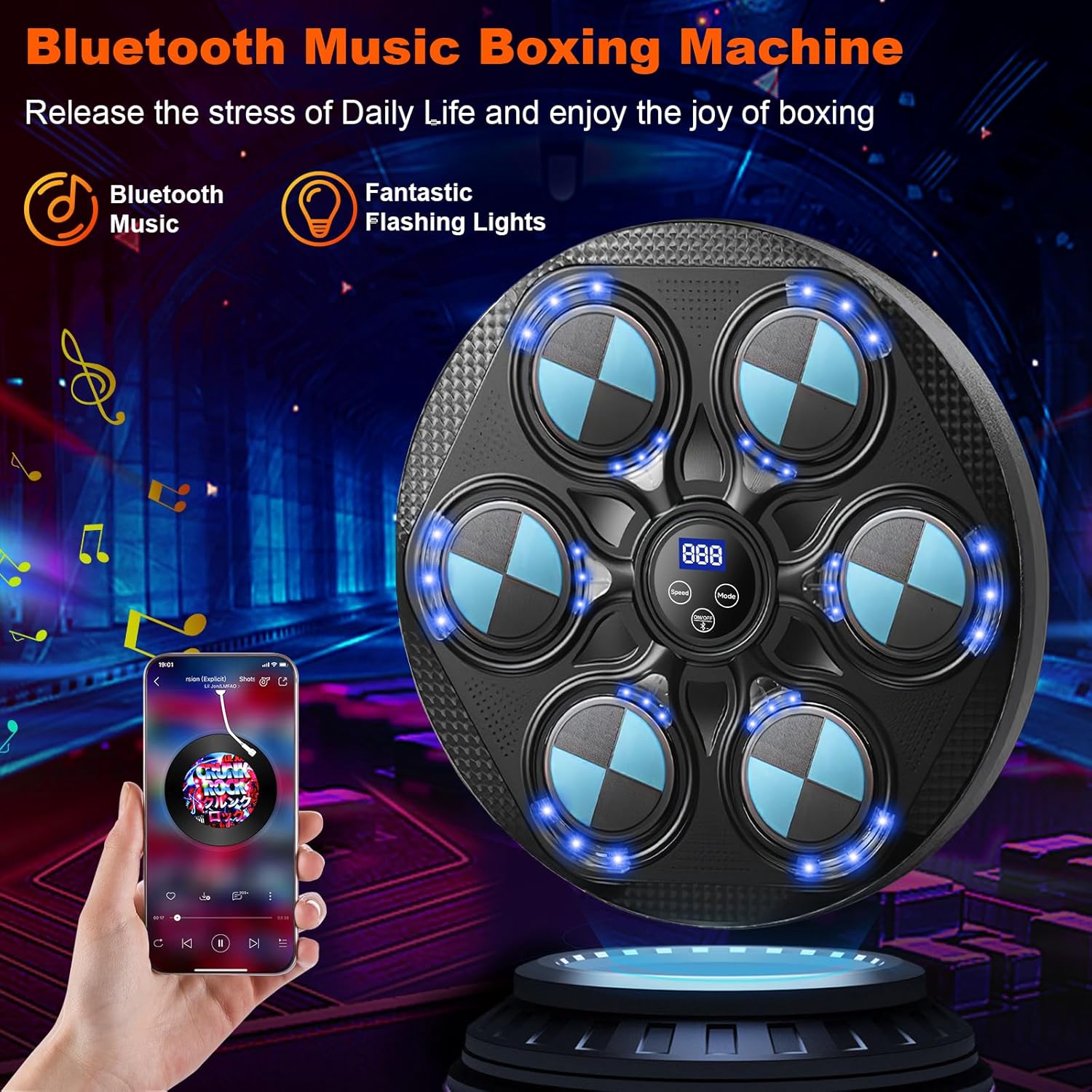 Машината за музички бокс е опремена со Bluetooth конекција и вграден звучник, можете да ги изберете вашите омилени песни преку Bluetooth за време на тренингот за бокс, што ќе ве држи мотивирани за време на тренингот, комбинација од омилена музика со LED трепкање во ритамот и кул светлосни ефекти, тренирајте ги вашите сетила и координација – го прави тренингот за бокс позабавен и повозбудлив.